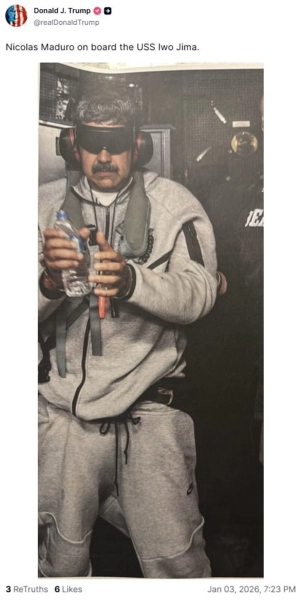 Дональд Трамп розмістив світлину Ніколаса Мадуро на палубі авіаносця USS Iwo Jima після його арешту американськими силами спеціального призначення. Мадуро стане об’єктом судового процесу в США за звинуваченнями у наркотичному тероризмі та нелегальному обігу зброї.