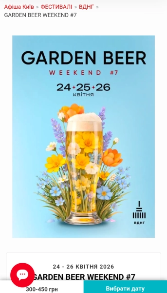 24–26 квітня – Garden Beer Weekend #7 – Київ У культурному осередку ВДНГ (Київ) Garden Beer Weekend #7 відкриє свої двері 24–26 квітня 2026 року для поціновувачів крафтового пива, їжі на вулиці та музики під відкритим небом. Подію навіть додали до афіш сервісів продажу квитків як одну з найвизначніших фестивальних подій весни.