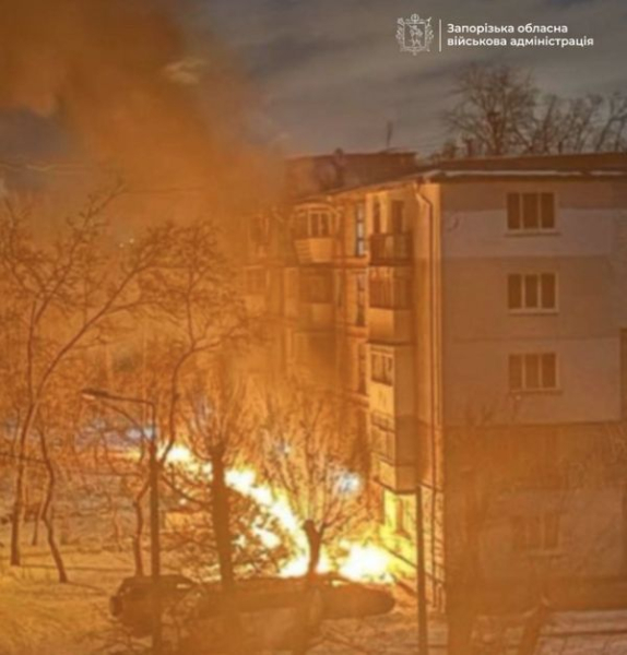 Супротивник здійснив по Запоріжжю не менше 9 атак. Велике загоряння виникло в житловій зоні міста після нападу «шахеда», повідомили у Запорізькій обласній державній адміністрації.