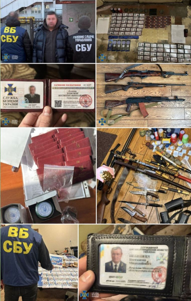 Під час обшуків у помешканнях та офісах фігурантів вилучено мобільні телефони, комп’ютерне обладнання, фальшиві штампи та печатки державних установ та бойові засоби ураження. Окрім того, у зловмисників вилучено близько ста «посвідчень» СБУ, інших воєнізованих та правоохоронних утворень, а також фіктивні накази, довідки та проросійські пропагандистські листівки.