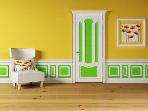 Дверне полотно можна пофарбувати як повністю, так і окремими ділянками (наприклад, обвести фільонки контрастною лінією). Як варіант – виділити кольором тільки отвір з наличниками, тоді самі двері оформити в тон стінам. Гра з кольором дверей вдало підтримають віконні укоси, пофарбовані тією ж фарбою. Або дерев'яні віконні рами (пластикові для цієї мети не підійдуть). Найнудніший завіконний пейзаж, укладений у кольорову рамку, стає схожим на художній твір і виглядає набагато цікавіше.